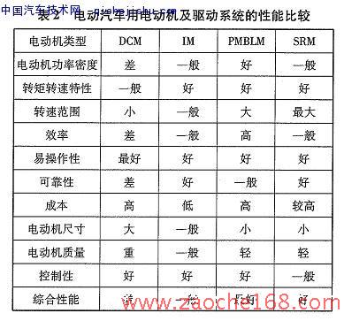目前,電動(dòng)汽車用電動(dòng)機(jī)主要有直流電動(dòng)機(jī)(DCM)、感應(yīng)電動(dòng)機(jī)(IM)、永磁無(wú)刷電動(dòng)機(jī)(PM-BLM)和開(kāi)關(guān)磁阻電動(dòng)機(jī)(SRM)4類,其性能對(duì)比見(jiàn)表2。