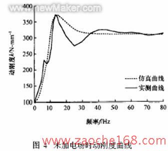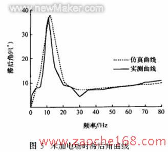 根據(jù)該力學(xué)模型以及文獻(xiàn)中提到的模型,設(shè)定有關(guān)的參數(shù)后,利用ADAMS軟件對(duì)系統(tǒng)的動(dòng)態(tài)特性進(jìn)行仿真,在未加電場(chǎng)時(shí),系統(tǒng)的動(dòng)剛度和響應(yīng)滯后角變化曲線如圖4、圖5中虛線所示。從圖中可以看出,電流變液壓懸置在未加電場(chǎng)時(shí),其動(dòng)態(tài)特性與傳統(tǒng)的被動(dòng)式液壓懸置相類似。