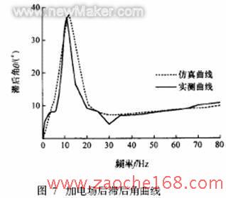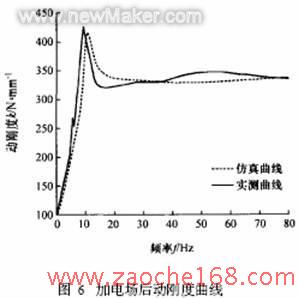 通過(guò)對(duì)比仿真計(jì)算和試驗(yàn)測(cè)試的液壓懸置的動(dòng)剛度和滯后角曲線,可以看出兩者比較吻合,從而驗(yàn)證了模型的正確性。一個(gè)比較理想的懸置需要低頻高剛度大阻尼、高頻低剛度小阻尼的動(dòng)態(tài)特性。對(duì)于電流變液力懸置,可以通過(guò)控制阻尼孔電極之間的電場(chǎng)的大小,調(diào)節(jié)電流變液的特性,從而改變懸置動(dòng)剛度和滯后角曲線的峰值大小及其發(fā)生的頻率。圖6和圖7中虛線為施加電場(chǎng)后電流變液懸置的動(dòng)剛度和滯后角的仿真結(jié)果。實(shí)線為相應(yīng)的施加電場(chǎng)后的實(shí)測(cè)曲線。