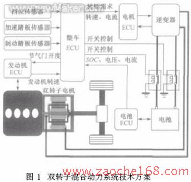 2003年以來,中國汽車技術(shù)研究中心投入力量研究雙轉(zhuǎn)子混合動力總成,采用一種由內(nèi)外兩個(gè)徑向式磁路結(jié)構(gòu)的復(fù)合電機(jī)組成一體化的雙轉(zhuǎn)子混合動力電機(jī),代替一般的發(fā)電機(jī)和電動機(jī)分離式結(jié)構(gòu)。通過內(nèi)外兩個(gè)電機(jī)的協(xié)調(diào)工作使發(fā)動機(jī)運(yùn)行于最高效率點(diǎn),從而提高系統(tǒng)的總效率。以雙轉(zhuǎn)子電機(jī)為動力耦合部件,開發(fā)出用于某SUV車型的混合動力總成樣機(jī)。經(jīng)試驗(yàn)證明雙轉(zhuǎn)子混合動力總成可以對發(fā)動機(jī)工作點(diǎn)實(shí)施有效控制,并且雙轉(zhuǎn)子電機(jī)自身具備減速增轉(zhuǎn)矩功能,能夠取消離合器和變速器,降低整車開發(fā)成本。
