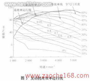 確定發(fā)動機(jī)高效率運(yùn)行線的方法如下:(1)通過發(fā)動機(jī)臺架試驗(yàn),測出發(fā)動機(jī)MAP圖,得到發(fā)動機(jī)工作面上各點(diǎn)的有效燃油消耗率;(2)在發(fā)動機(jī)MAP圖上畫出等功率線;(3)在每條等功率線找出最低的有效燃油消耗率點(diǎn);(4)將各個(gè)最低有效燃油消耗率點(diǎn)連接起來,得到發(fā)動機(jī)的高效率運(yùn)行線。發(fā)動機(jī)高效率運(yùn)行線如圖3所示。