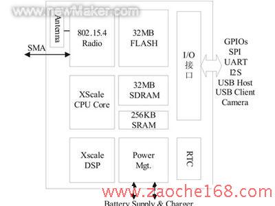 在設(shè)計(jì)無線傳感器網(wǎng)絡(luò)網(wǎng)關(guān)時(shí),需要較強(qiáng)的數(shù)據(jù)處理能力,用以實(shí)現(xiàn)復(fù)雜路由協(xié)議以及信息處理等。如圖5所示Crossbow的imote2節(jié)點(diǎn)采用了MarvellPXA271高性能、低功耗處理器。該處理器使用動(dòng)態(tài)電壓調(diào)節(jié)技術(shù),頻率范圍13MHz~416MHz,可工作于低電壓(0.85V)低頻率(13MHz)模式,具備了優(yōu)良的動(dòng)態(tài)電源管理技術(shù)。此外,該處理器封裝內(nèi)集成三個(gè)芯片256KBSRAM,32MBFLASH以及32MBSDRAM,減小了體積。通過提供多種I/O,能夠靈活的支持不同種類的傳感器。該處理器還支持一個(gè)MMX協(xié)處理器,提高多媒體處理能力,可以用于無線多媒體傳感器網(wǎng)絡(luò)中的語音和圖像處理。Imote2使用TI的CC2420ZigBee射頻芯片,支持2.4GHz、16通道250kb/s數(shù)據(jù)傳輸,發(fā)送功率-24~0dBm。有效通訊距離是30米,可以通過SMA接口外接天線來增加傳輸距離。