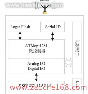 典型的終端節(jié)點(diǎn)和匯聚節(jié)點(diǎn)設(shè)計(jì)如圖4所示,采用Atmel的8位RISC結(jié)構(gòu)低功耗ATMegal1281VMCU作為系統(tǒng)控制核心。采用512KB的AT45DB041D作為外部程序存儲(chǔ)器。射頻模塊使用Atmel的支持ZigBee協(xié)議的AT86RF230,RF功率達(dá)到3dBm,室外傳輸距離可達(dá)300米以上節(jié)點(diǎn)的擴(kuò)展接口可連接模擬輸入、數(shù)字I/O、I2C、SPI和UART接口,這些擴(kuò)展接口使其易于與傳感器及其它外設(shè)連接,例如外接光度、溫溫度、氣壓、聲、地磁和加速度等傳感器。