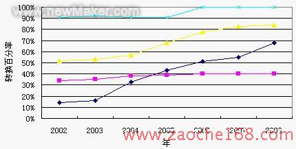 以減少VOC和有害重金屬為代表的環(huán)保型漆前處理材料和環(huán)保型涂料不斷得到推廣應(yīng)用,在歐美,新的涂裝生產(chǎn)線已經(jīng)全部普及應(yīng)用環(huán)保型材料,日本近幾年也加快了推廣速度。在國內(nèi),國外獨資及合資的涂料生產(chǎn)企業(yè)具備可在國內(nèi)加工生產(chǎn)水性中涂和水性面漆的能力(部分國內(nèi)自主汽車涂料廠近幾年進步也較快,但與國際水平仍有較大差距,還不能滿足汽車行業(yè)的需求),歐、美、日等國的汽車合資企業(yè)和我國幾大汽車公司新的車身涂裝生產(chǎn)線多已經(jīng)考慮應(yīng)用水性中涂及水性面漆的可能性,有的已經(jīng)開始應(yīng)用水性中涂和水性面漆底色[1]??傮w上就車身涂裝而言,前處理及底漆應(yīng)用各國水平基本相當。中涂和面漆,北美高固體份涂料、粉末涂料較普及,水性涂料近幾年也開始應(yīng)用。歐洲水性涂料應(yīng)用較普遍,一代中涂(水性、粉末)已經(jīng)開始被低成本轉(zhuǎn)換概念(LCCC)中涂(低膜厚水性中涂和低膜厚粉末)所替代,烘干規(guī)范和溶劑型完全相同(晾干20℃/6~8分鐘、升溫6~8分鐘、保溫160℃/12~15分鐘),外觀質(zhì)量優(yōu)于第一代;寬施工工藝窗(50%~80%RH、20~32℃)的金屬和塑料通用的水性底色開始應(yīng)用、底色噴涂和罩光漆之間不需要紅外烘干和冷卻,可以降低設(shè)備和生產(chǎn)運行成本;2K高固化體份溶劑型或水性清漆應(yīng)用比較普及,適應(yīng)VOC排放要求的同時,抗擦傷性能進一步提高;粉末罩光漆應(yīng)用不斷改進,已經(jīng)成熟,將進一步推廣。日本水性涂料應(yīng)用剛剛起步,高固體份涂料和粉末涂料應(yīng)用較少。中國涂料應(yīng)用水平主流與日本相當,但有些小汽車廠相對落后。目前,車身涂裝降低VOC效果最顯著的是水性面漆底色的應(yīng)用,歐、美、日從溶劑型底色向水性底色轉(zhuǎn)換及預(yù)測見圖1。