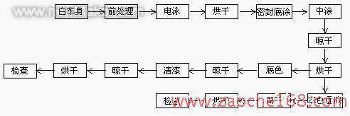 車身涂裝歷來是汽車涂裝的代表。由于汽車車身結(jié)構(gòu)復(fù)雜多變,裝飾性要求高,所以其涂裝工藝最復(fù)雜。經(jīng)過多年的發(fā)展,公認的典型涂裝工藝(如圖2所示)可以很好地滿足金屬車身要求,而且如上所述在德國已經(jīng)完全實現(xiàn)環(huán)保型涂裝材料的應(yīng)用,VOC排放降到了30g/m2以下[2]。
