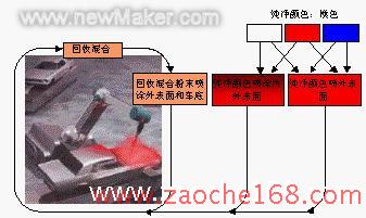 將粉末涂料用作逆過程工藝中的外表底漆中涂、上述典型工藝中的中涂、抗石擊涂層、面漆、罩光等[3]。粉末噴涂突出的優(yōu)點是:無VOC排放,無噴漆廢水產(chǎn)生,材料利用率高(98%以上),噴漆室空調(diào)新鮮空氣用量低(只相當于液態(tài)涂料噴涂室的20%,80%的噴涂室排風循環(huán)使用),大幅度降低運行費用。以前粉末噴涂的換色及回收粉的循環(huán)使用是個難題,現(xiàn)在已經(jīng)有圓滿的解決方案。粉末底色噴涂要經(jīng)過3道工序完成,見圖3?;厥盏倪^噴粉末與一定比例新粉混合用于第一道噴涂車身外表面及車底,第二道噴涂純凈色粉于車身內(nèi)外表面,第三道噴涂純凈色粉于外表面。這樣顏色更換時不必清理噴涂室,系統(tǒng)完全可以實現(xiàn)回收粉和新粉的平衡,實現(xiàn)多種顏色的噴涂。德國BMW公司自1997年以來,應(yīng)用粉末噴涂工藝已經(jīng)累計生產(chǎn)100萬輛車,他們已經(jīng)陸續(xù)在德國和美國的工廠進一步普及。最近,性能更好的 UV固化粉末清漆應(yīng)用技術(shù)也已經(jīng)趨于成熟,優(yōu)良的抗擦傷性能和卓越的流平性,可使清漆厚度從現(xiàn)用的(55—60)μm減少到(30—35)μm,不但可以克服上一代粉末清漆必須厚涂的問題,而且UV固化工藝效率比加熱固化提高了數(shù)十倍。預(yù)計2007到2008年將工業(yè)化應(yīng)用。
