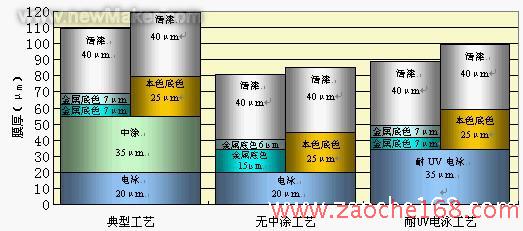 (3C1B概念)一體化涂裝(Integrated coat)工藝是采用與面漆同色的功能層(15μm)替代中涂[2],功能層與面漆底色濕碰濕噴涂,在一條線(面漆線)上完成,生產(chǎn)過程簡化,省去了中涂烘干線。在此基礎(chǔ)上,又有無中涂工藝(Primerless Paint System)得到應(yīng)用[2]。該工藝與3C1B工藝相比,進一步簡化,將前述的功能層與面漆底色合一,徹底取消了中涂線,與耐UV電泳工藝比可以節(jié)省電泳漆40%。如圖4所示,無中涂工藝涂層厚度最低,材料消耗最少。