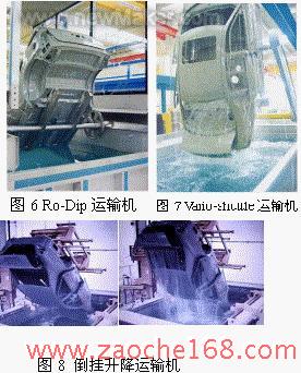 傳統(tǒng)典型的運輸機(推桿懸鏈、擺桿運輸鏈、自行葫蘆)對漆前表面處理和電泳都不同程度地存在難以解決的問題或不利影響(如處理槽體無效容積大、吊具污染、車身封閉腔排汽不良、帶液量大、車身水平面易出現(xiàn)漆膜弊病等)。現(xiàn)在,可使被處理車身旋轉(zhuǎn)的新型多功能穿梭機(Vario-Shuttle)、滾浸運輸機 (Ro-Dip)和倒掛升降運輸機誕生后,在解決了這些問題的同時兼具傳統(tǒng)運輸機的所有優(yōu)點。多功能穿梭機可單獨控制升降和翻轉(zhuǎn)軌跡,可變處理時間,具有在一條生產(chǎn)線上實現(xiàn)多品種不同工藝的功能,完全符合自動化柔性涂裝生產(chǎn)的要求,如圖6、7、8所示。
