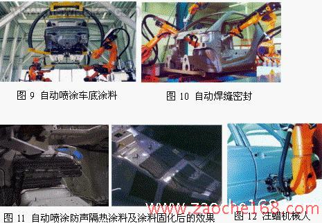 涂裝車間人工勞動量最大、工作環(huán)境最差的環(huán)節(jié)是焊縫密封、車底噴涂、噴漆和內(nèi)腔注蠟,這些環(huán)節(jié)很難實現(xiàn)完全自動化,即使噴漆和注蠟實現(xiàn)全自動化,系統(tǒng)也十分復(fù)雜,且對多品種混流生產(chǎn)方面有局限性?,F(xiàn)在,隨著材料、機械人和噴涂設(shè)備的技術(shù)進步,這些環(huán)節(jié)可以完全實現(xiàn)自動化,且對混流生產(chǎn)的適應(yīng)性更強,見圖9、10、11、12。由于新型的PVC噴涂系統(tǒng)噴形準確,沒有飛濺,機械人動作重復(fù)精度提高,所以可取消遮蔽,密封及絕熱涂料沒有浪費,不再需要帶供排風的車底噴涂室,環(huán)境空調(diào)等也可省去,工位也不像從前那樣臟亂。