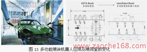 典型的側(cè)噴加頂噴式中涂和面漆用自動涂裝機(ESTA)對多品種生產(chǎn),尤其是車形尺寸差別大的情況下,有局限性,頂噴機的噴涂功能局限性更大,且對涂裝質(zhì)量有不利影響。隨著機器人技術(shù)的進步,多功能噴涂機器人(Vario-Robot)得到應(yīng)用,顯示出其功能方面的突出優(yōu)點。不僅使標準的自動噴涂段噴杯數(shù)量由9支減少到6支,標準噴漆室寬度由4.6米減少到3.8米,可節(jié)能17%,而且,取消了頂噴機橫梁,消除了典型自動噴涂機的種種弊端(如圖13所示)。使噴涂質(zhì)量進一步提高,更適應(yīng)柔性生產(chǎn),一次投資和運行成本進一步減少,新車型上線和設(shè)備維修更容易。