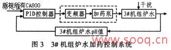 3.1 控制流程 圖3給出3#機(jī)組的爐水加藥控制系統(tǒng)。該系統(tǒng)從在線分析儀表(磷酸根表、pH表)中提取4~20mA信號,根據(jù)運行工藝參數(shù)和確定的數(shù)學(xué)模型進(jìn)行窗口式PID復(fù)合運算,中間結(jié)果送變頻器,控制加藥泵加藥量以實現(xiàn)加藥的自動閉環(huán)調(diào)節(jié)。