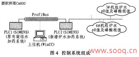 3.2 控制系統(tǒng)組成 該控制系統(tǒng)選用上位機(jī)軟件WinCC+西門子PLC的組合方案。PLC系統(tǒng)通過PorfiBus總線方式與上位機(jī)WinCC連接。如圖4所示。其中上位監(jiān)控部分由工業(yè)計算機(jī)(WinCC)來完成。監(jiān)控工作人員可通過CRT實時監(jiān)控系統(tǒng)的運行狀況.設(shè)定或修改系統(tǒng)的運行參數(shù),同時通過CRT遠(yuǎn)程軟件控制系統(tǒng)運行。上位工控機(jī)進(jìn)行數(shù)據(jù)處理和管理,并與MIS系統(tǒng)等聯(lián)網(wǎng)。上位機(jī)可對控制器進(jìn)行組態(tài),組態(tài)范圍包括控制器的網(wǎng)絡(luò)地址和時間、選擇控制算法、設(shè)定算法參數(shù)、設(shè)定控制量的設(shè)定點、選擇算法中輸入量及輸出量的通道等。下位控制部分由安裝在現(xiàn)場的一套可編程控制器(PLC)來完成。它是自動加藥控制系統(tǒng)的核心,用于采集相應(yīng)的水質(zhì)數(shù)據(jù)。由于化學(xué)加藥系統(tǒng)具有純滯后性質(zhì),會導(dǎo)致控制作用不及時,引起系統(tǒng)產(chǎn)生超調(diào)或振蕩,而利用計算機(jī)可方便實現(xiàn)滯后補償。采用改進(jìn)的數(shù)字PID控制算法和模糊控制算法,使控制器利用輸出控制信號調(diào)節(jié)現(xiàn)場的交流變頻器,進(jìn)而控制電機(jī)的轉(zhuǎn)速,以調(diào)節(jié)加藥泵。電氣部分的控制方式設(shè)計為遠(yuǎn)程和本地兩種,以實現(xiàn)手動/半自動/自動三種功能,后兩種功能由上位機(jī)切換。