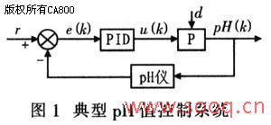 PID控制是按偏差的比例(P—Proportional)、積分(I—Integral)和微分(D—Derivative)線性組合的控制方式。圖1為常規(guī)的PID控制系統(tǒng)。其中,r為參考輸入信號;PID為控制器;P為被控對象模型;d為干擾量;e(k)為系統(tǒng)誤差;u(k)為控制量;pH(k)為被控過程輸出量。由圖可見,常規(guī)PID控制中的比例作用實際上是一種線性放大或縮小作用,很難適應(yīng)酸堿中和過程中被控對象非線性的特點(diǎn)。