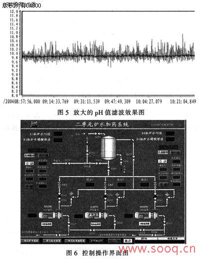 控制系統(tǒng)中.濾波程序的基本原理是在周期內(nèi)連續(xù)采樣5個數(shù)值,并求出其平均值采集當(dāng)前值,并求出采集值與平均值的差值△=Xi一X;若|△|>0.2,則舍棄Xi,取X=0.2作為按實際情況設(shè)定的信號波動范圍值;若|△|≤0.2,則Xl出棧,X2替換X1,X3替換X2,X4替換X3,依次遞推。用當(dāng)前采樣的X6替換X5,然后用這5個新數(shù)值再求X,進(jìn)行比較,如此循環(huán)執(zhí)行該程序即可實現(xiàn)濾波功能。圖5為采用濾波程序后,放大了的pH值趨勢,由此可見,濾波效果良好。圖6給出控制操作界面圖。