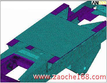 該車架長7m,寬約0.9m,包括雙層縱梁、橫梁、外包梁、背靠梁、鞍座、飛機板、鑄鐵加強板、發(fā)動機安裝板、三角支撐板和后軸等部分組成??紤]到車架幾何模型的復雜性,可在三維CAD 軟件UG 里建立好車架的面模型,導入到Hypermesh 軟件中進行網格劃分等前置處理,然后提交到Ansys 解算。車架各層之間通過鉚釘聯(lián)接,可以用Hypermesh—connectors 中的bar 單元來模擬鉚釘聯(lián)接,對應的是ANSYS 的MPC 單元,因車架各層間既有拉壓應力,又有剪應力,故MPC 的類型應選擇Rigid Beam 方式。由于該車是多軸車,為超靜定結構,為了得到車架結構的真實應力分布,必須考慮懸掛系統(tǒng)的變形情況。整個車架結構應力分析的有限元模型由車架有限元模型和懸掛系統(tǒng)等效有限元模型組成,其中縱橫梁、加強板等為薄壁結構,以殼單元shell63 離散;鋼板彈簧、輪胎以彈簧單元模擬;前懸彈簧的模型為在每邊縱梁上采用2 個彈簧單元,每個彈簧單元通過MPC 與車架連接,后懸彈簧的模型為在每邊縱梁上采用1 個彈簧單元與車架后軸連接。殼單元總數為46770 個,MPC 單元為1338 個,材料為歐洲高強度材料,楊氏模量為2E5MPa,泊松比0.3。網格劃分后的局部模型如圖2 所示。