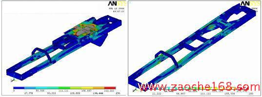車架在右后輪抬高的彎曲扭轉工況時,高應力區(qū)集中在車架縱粱的第三橫梁附近及后軸位置上的加強板處,其值不超過330MPa。焊接部位的高應力區(qū)也在第三橫梁上,焊接處應力最大值不超過250MPa,說明在這種焊接結構下,焊接性能優(yōu)良,焊縫結構值得借鑒,橫梁設計合理,可以用于改進其它車型的車架橫梁結構。