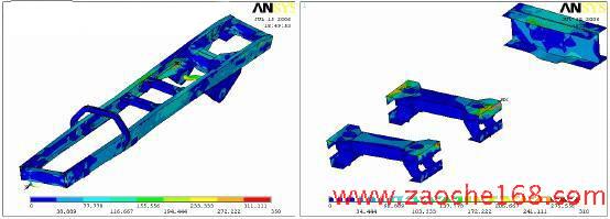 經上述分析可知,該車架的結構設計合理,大部分部位應力遠小于車架材料的抗拉強度,性能穩(wěn)定,焊接性能優(yōu)良??赏ㄟ^優(yōu)化的方法在保證或提高性能的前提下,改進車架結構,減輕車架自重。