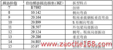 從模態(tài)分析可知:車架固有振型分為兩類:一類是車架的整體振動,另一類是以車架一個或幾個部分振動為主的局部振動。7 到15 階模態(tài)頻率分布在8-36Hz 范圍內,且以整體振動為主的模態(tài)振型較多,其中第7、15 階振型屬于扭轉振型,第8、10、12、13 階振型屬于彎曲振型,第12、15 階伴隨有車架的局部振動,第9、11、14 階振型為局部振動,主要集中在鞍座和外包梁兩個位置。模態(tài)分析結果表明該車架剛度較好。