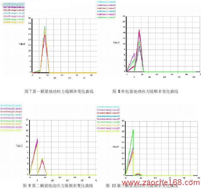 從車架典型部位的應力隨頻率變化的曲線知,車架大多數部位,在頻率為5Hz 和8Hz時,應力會發(fā)生突變,主要是因為車架的第七階固有頻率為8.7392Hz,在這個頻段中,車架系統(tǒng)在路面不平度的作用下發(fā)生較強烈的共振現(xiàn)象。由于路面不平度的激勵頻率大都集中在0-20Hz 之間,所以它與車架固有頻率的耦合而引起的共振現(xiàn)象屬于低頻共振,低頻共振對車架振動的貢獻遠遠大于高頻共振。引起車架乘坐舒適性的下降,此外,雖然車架的動應力不大,但突變嚴重,有可能成為車架疲勞破壞的原因之一。