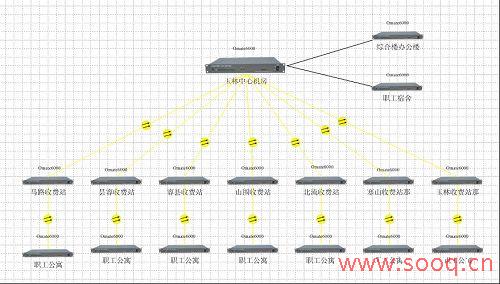 辦公網(wǎng)絡(luò)采用24臺(tái)Omate6000以太網(wǎng)交換機(jī),先由網(wǎng)通提供光纖專線連接路由器,路由器再通過(guò)SDH通信系統(tǒng)連接Omate6000以太網(wǎng)交換機(jī)到各個(gè)辦公大樓及下邊各個(gè)收費(fèi)站辦公室、職工公寓。