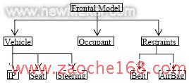 如圖1 所示, MADYMO 正撞模型包括車體(vehicle),乘員(occupant) 和約束系統(tǒng) (restraints)