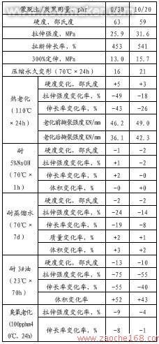 利用少量的蒙脫土和炭黑共同補(bǔ)強(qiáng)天然橡膠,可使材料的綜合性能改善。表1反映了10份蒙脫土替代10份炭黑時(shí)對(duì)天然橡膠各項(xiàng)性能的影響,由表可見(jiàn),材料的硬度減小,定伸強(qiáng)度、拉伸強(qiáng)度、斷裂伸長(zhǎng)率都明顯提高,耐水、耐油、耐熱氧老化、耐臭氧老化等性能較以前都明顯提高。對(duì)于露天使用的軌道交通用橡膠減振器,蒙