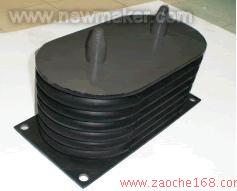 由于橡膠堆產(chǎn)品其橫向變位能力不足,難以承受更大的橫向變位,因此,國(guó)外采用了一種稱為搖枕的減振橡膠制品,用于二系懸掛,通常四個(gè)為一組,反對(duì)稱安裝在機(jī)車車輛轉(zhuǎn)向架上。與橡膠堆相比,其具有以下特點(diǎn):①鐵件隔板為微圓弧形,厚度約為1.5毫米,且端板與隔板間填充橡膠,重量較橡膠堆更輕。②垂向預(yù)壓下,能產(chǎn)生一定的橫向定位,這有利于搖枕獲得更優(yōu)的變位能力。③利用鐘擺效應(yīng),提供滾動(dòng)穩(wěn)定性,有利于機(jī)車車輛的曲線通過(guò)。④能有效地隔離垂向及橫向沖擊和震動(dòng)。此產(chǎn)品經(jīng)時(shí)代新材開(kāi)發(fā)后也已在國(guó)內(nèi)推廣使用。
