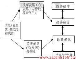 炭黑表面含有羧基、羥基等多種官能團(tuán),白炭黑的表面也有大量的羥基官能團(tuán),可以利用這些高活性的基團(tuán)來(lái)改善炭黑與白炭黑對(duì)橡膠的作用。