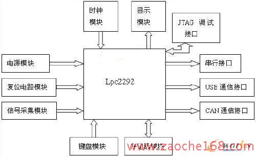 該課題所設(shè)計(jì)的汽車行駛記錄儀選用帶有ARM7TDMI-S內(nèi)核的LPC2292為微控制器,操作系統(tǒng)采用UC/OS-Ⅱ嵌入式操作系統(tǒng)。該系統(tǒng)可實(shí)現(xiàn)對車速信號(hào)、開關(guān)量信號(hào)以及模擬量信號(hào)的采集、處理以及數(shù)據(jù)的實(shí)時(shí)存儲(chǔ)和顯示,通過串口、USB接口可以實(shí)現(xiàn)與PC機(jī)之間的數(shù)據(jù)通信,通過CAN總線接口可實(shí)現(xiàn)與汽車上的CAN節(jié)點(diǎn)間的數(shù)據(jù)通信。該系統(tǒng)的外圍接口模塊有電源模塊、復(fù)位電路模塊、信號(hào)采集模塊、鍵盤操作模塊、存儲(chǔ)器模塊、時(shí)鐘模塊、顯示模塊、JTAG調(diào)試接口以及通信接口模塊,系統(tǒng)的組成框圖如圖1所示。