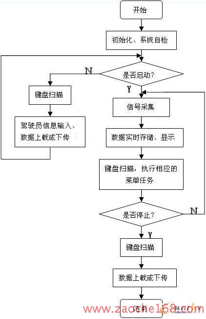 本課題中汽車行駛記錄儀軟件部分所要實(shí)現(xiàn)的功能是對汽車的行駛狀態(tài)數(shù)據(jù)的定時(shí)采集、存儲(chǔ)、與PC機(jī)進(jìn)行串口和USB通信、與汽車的其它CAN節(jié)點(diǎn)間的通信、LCD顯示、鍵盤輸入、打印輸出等功能。該系統(tǒng)的主程序流程圖如圖2所示。