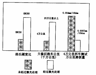 試驗證明:激光表面處理的曲軸,經(jīng)600h臺架試驗,耐磨性能良好,其最大磨損量為0.02mm,達到國家規(guī)定的要求,可滿足2×105km大修期標準。
