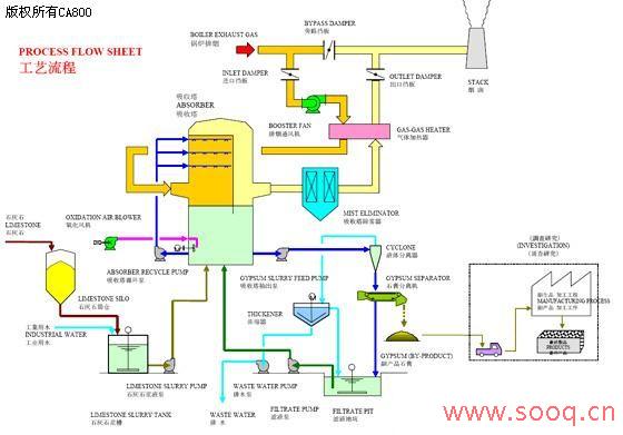煙氣脫硫系統(tǒng)工藝主要包含:煙氣系統(tǒng)、吸收系統(tǒng)、石灰石漿液制備及供給系統(tǒng)、石膏旋流系統(tǒng)、石膏脫水系統(tǒng)、排空系統(tǒng)、廢水處理系統(tǒng)等。由以下主要部件組成:吸收塔、氣氣換熱器、增壓風(fēng)機(jī)及其它設(shè)備和輔助系統(tǒng)、石灰石漿液制備和石膏脫水機(jī)等。