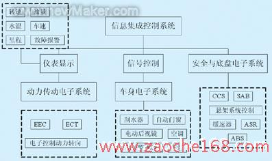 ;儀表顯示的信息來源于動力傳動電子系統(tǒng),將駕駛信息集中顯示于儀表盤,顯示駕駛過程中與客車行駛有關(guān)的信息量,如車速、轉(zhuǎn)速、里程、油量、水溫、故障報警等;安全與底盤電子系統(tǒng)包括abs(anti-lock brake system 防抱死制動控制)、asr(anti-slide retractor驅(qū)動防滑控制)、sab(safety air bag安全氣囊控制)、ccs(cruise control system巡航控制)、緩速器、懸架系統(tǒng)控制等;信號控制與車身電子系統(tǒng)組成單元有關(guān),控制著自動門窗、車燈、空調(diào)、刮水器、音像設(shè)備、電子監(jiān)視器、電動后視鏡、車頂窗。
