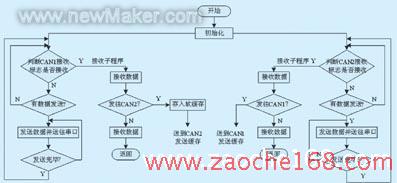 由于傳輸速率不同,高低速can網(wǎng)絡(luò)之間的數(shù)據(jù)傳輸是不同的。當(dāng)高速can網(wǎng)絡(luò)數(shù)據(jù)向低速can傳輸時,需要加入軟緩存進行暫時的存儲;當(dāng)?shù)退?/SPAN>can網(wǎng)絡(luò)數(shù)據(jù)向高速can網(wǎng)絡(luò)傳輸時,可直接傳輸。整體流程如圖4所示。