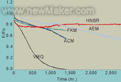 圖2顯示在非通風(fēng)條件下在1500C的5W20機(jī)油中老化最多2800小時(shí)的壓縮應(yīng)力松馳性能。在硅氧烷樣品中觀察到以老化為函數(shù)的密封保持力下降最明顯,在測試1360小時(shí)之后,僅保持百分之幾的對(duì)比壓力(reduced force)。其它4種化合物顯示相似的CCSR性能,其中的區(qū)別更加緩和。在1360小時(shí)之后,ACM樣品下垂到大約58%的對(duì)比壓力。FKM曲線顯示對(duì)比壓力下降特別緩慢,直到1360小時(shí)。VMQ、ACM和FKM的樣品測試在1360小時(shí)停止。AEM在開始造成密封力最初上升,然后一般下降到最高性能,在1100小時(shí)左右開始斷裂,在此點(diǎn)曲線開始緩慢下降到2800小時(shí)的大約55%對(duì)比壓力。對(duì)于ACM和AEM型橡膠,在1500C的SF-105G測試機(jī)油中觀察到相似測試結(jié)果(參考23)。HNBR樣品顯示密封力性能更持續(xù),在200小時(shí)之后最初下降到最高值80%,保持到測試2800小時(shí)。