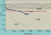 表1顯示在室溫測量時(shí)所有五種化合物的應(yīng)力應(yīng)變特征。所有樣品的硬度約為65±5pts,為用于發(fā)動(dòng)機(jī)密封應(yīng)用,例如密封或襯墊的典型化合物的硬度范圍。在所有樣品中,HNBR的拉伸強(qiáng)度明顯最高,硅氧烷最低。所有五種化合物的延伸率數(shù)值從接近200到最高300%。FKM和硅氧烷在低延伸率時(shí)應(yīng)力更高,而AEM和HNBR在延伸率超過100%時(shí)應(yīng)力更高。HNBR的撕裂強(qiáng)度也比其它化合物高。