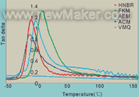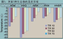 優(yōu)良低溫特性對(duì)于密封和襯墊應(yīng)用功能良好極其重要。良好的低溫密封保持性能可防止出現(xiàn)問題,例如密封提前泄漏,特別是在冷起動(dòng)條件下。圖4顯示5種化合物在各種溫度范圍(-500C至1500C)下的介損(Tan Delta)性能。硅氧烷橡膠在此溫度范圍介損最低,表明密封化合物彈性特性穩(wěn)定和極其恒定。介損數(shù)據(jù)峰值與玻璃態(tài)轉(zhuǎn)換溫度有關(guān),最低溫度(硅氧烷之后)顯示是ACM,然后是HNBR和AEM,最后是FKM。彈性特性的保持性能(儲(chǔ)能模量)對(duì)于部件的使用極其關(guān)鍵??梢悦黠@觀察到,在玻璃態(tài)轉(zhuǎn)換區(qū)域到更高溫度,VMQ和HNBR的彈性特性最穩(wěn)定,而FKM和AEM的動(dòng)態(tài)特性變化最大。5種化合物的溫度回縮測量見圖5??梢钥闯?,硅氧烷的低溫性能最佳,其次是ACM、HNBR和AEM,然后是FKM。這些結(jié)果與圖4中觀察到的介損最大值同時(shí)出現(xiàn)。除高溫性能以外,低溫密封顯然同等重要??梢栽跍囟妊h(huán)條件下使用CCSR測量這些特性。