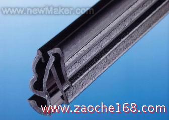 汽車密封條的橡膠材料有密實膠、海綿膠和硬質(zhì)橡膠三種。硬質(zhì)橡膠的硬度可達邵氏A95。密封條的膠料較多使用耐老化、耐低溫、耐水氣、耐化學腐蝕,特別是耐臭氧老化的三元乙丙橡膠(EPDM)。EPDM可以與鋼帶、鋼絲編織帶、TPE、絨布、植絨、PU涂層、有機硅涂層等復(fù)合,保證汽車室內(nèi)與外界及自身的防水、防塵、隔音、隔熱、減振、防磨和裝飾作用。一般情況下EPDM密封條可穩(wěn)定使用十幾年。也可選擇具有良好耐臭氧性能及良好耐老化性能的氯丁橡膠(CR)。考慮到常用膠料的工藝性能,有時還需要選用并用橡膠,如天然橡膠(NR)與CR及丁苯橡膠(SBR)三種橡膠并用或聚乙烯(PE)、EPDM及NR橡塑并用型以改進耐臭氧性。