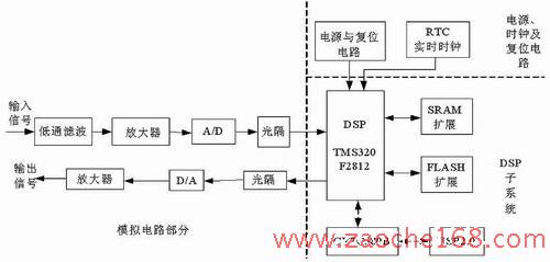 如圖2所示,智能控制器主要由模擬電路部分(包括數(shù)字信號采集電路和輸出信號處理電路)、DSP子系統(tǒng)(包括DSP芯片及外圍電路)、電源、時鐘及復(fù)位電路等構(gòu)成。下面將介紹幾個主要電路的設(shè)計。