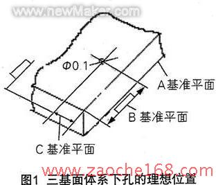 如圖1,孔的理想位置就是采用 A、B、C 3個相互垂直的基準平面定位。這3個相互垂直A、B、C基準平面構成一個三面體系,常稱為三基面體系,它是確定零件上各要素幾何關系的起點。三基面體系里,基準平面按功能要求有順序之分,最主要的為第一基準平面(A),依次為第二(B)和第三(C)基準平面。