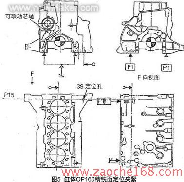 缸體OPl 60精銑缸蓋面、正時齒輪面、離合器面、變速器面加工所用坐標系采用兩面一銷,即底平面F1、F′1面+P15面+1只圓柱銷39。定位夾緊如圖5。