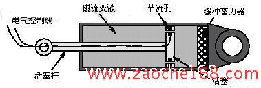 磁流變液在外加磁場作用下流變特性發(fā)生急劇變化,可由流動性良好的液體狀態(tài)在短時間(毫秒級)內(nèi)粘度增大,而呈現(xiàn)類似固體的狀態(tài),而且這種變化是連續(xù)、可逆的,即一旦去掉磁場后,又變成可以流動的液體,表現(xiàn)出優(yōu)良的可控性能。磁流變阻尼器基本組成原理如圖1所示: