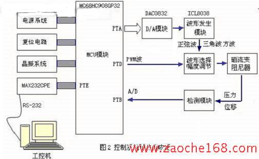 硬件設(shè)計(jì)框圖如圖2所示,主要由上位機(jī)、MCU模塊、D/A模塊、波形發(fā)生模塊、波形選擇與幅度調(diào)節(jié)模塊和檢測模塊組成。系統(tǒng)核心MCU模塊采用MC68HC908GP32單片機(jī),負(fù)責(zé)采集檢測模塊傳來的壓力、位移信號,進(jìn)行控制算法運(yùn)算,波形發(fā)生控制,MCU與上位機(jī)通過RS232進(jìn)行串行通信,把系統(tǒng)參數(shù)與狀態(tài)發(fā)送給計(jì)算機(jī),并接受計(jì)算機(jī)的指令。