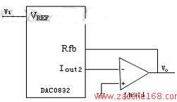 本文采用單片0832和運(yùn)放LM324構(gòu)成程控增益電路,其原理如圖4所示,輸入Vi接0832的VREF,運(yùn)放輸出Vo接0832的Rfb 。0832內(nèi)部是R-2R電阻網(wǎng)絡(luò),可以證明:Vo=-D Vi/256。其中D為單片機(jī)送入0832的數(shù)字量,增益A=-D/256。根據(jù)上述原理構(gòu)成的程控增益電路不僅能增益量程多變,而且具有寬的通頻帶,性價比高。