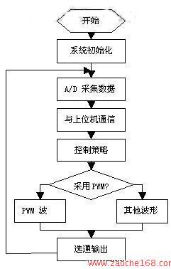 控制系統(tǒng)軟件設(shè)計(jì)流程圖如圖5所示,初始化主要是配置MC68HC908GP32的CONFIG寄存器和PLL控制寄存器,并初始化輸出波形。接著啟動GP32內(nèi)部A/D轉(zhuǎn)換器,采集壓力和位移信號,與上位機(jī)通信進(jìn)行數(shù)據(jù)處理和顯示,根據(jù)控制策略選擇合適的控制波形。這里給出主程序主體框架 (限于篇幅,程序框架大部分為子程序形式) :