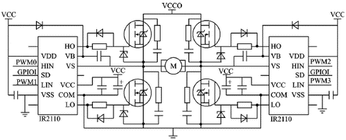 電動機(jī)控制電路的設(shè)計在電動助力轉(zhuǎn)向系統(tǒng)的設(shè)計中是比較關(guān)鍵的部分。隨著計算機(jī)進(jìn)入控制領(lǐng)域,以及新型的電力電子功率元器件的不斷出現(xiàn),直流電動機(jī)的結(jié)構(gòu)和控制方式都發(fā)生了很大的變化,采用全控型的開關(guān)功率元件進(jìn)行脈寬調(diào)制(Pulse Width Modulation,PWM)的控制方式已成為絕對主流。在本系統(tǒng)中,電機(jī)的控制就是采用的PWM脈寬調(diào)制控制方式。全橋雙極性驅(qū)動電路如圖3所示。