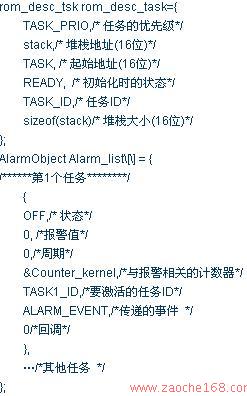 PICOS18通過taskdesc.c定義任務(wù)的各個參數(shù),并且是用OSEK/VDX規(guī)范中的OIL(OSEK/VDX的實(shí)現(xiàn)語言,類似于一個C結(jié)構(gòu)定義)編寫的[5].由于PICOS18沒有提供GUI用于任務(wù)的配置,因此只能逐句編寫。任務(wù)的參數(shù)定義結(jié)構(gòu)如下: