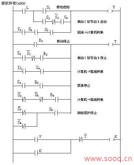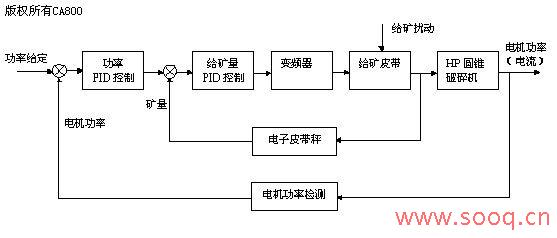 摘 要:本文設(shè)計(jì)了一套基于PLC的監(jiān)控系統(tǒng),應(yīng)用于金礦碎礦生產(chǎn)線控制系統(tǒng)改造。系統(tǒng)由性價(jià)比高的PLC,工控機(jī)和組態(tài)軟件構(gòu)成。通過PLC編程,實(shí)現(xiàn)了對生產(chǎn)設(shè)備的全面自動(dòng)控制、聯(lián)鎖保護(hù)、運(yùn)行狀態(tài)監(jiān)測等功能;運(yùn)用組態(tài)軟件,設(shè)計(jì)了具有良好的人/過程接口能力的監(jiān)控畫面,實(shí)現(xiàn)了過程信息的集中顯示和處理。實(shí)際運(yùn)行表明,該系統(tǒng)功能設(shè)計(jì)合理,運(yùn)行可靠,顯著提高了生產(chǎn)效率。 關(guān)鍵詞:金礦;設(shè)備改造;監(jiān)控系統(tǒng);PLC;組態(tài)軟件 1 引言 近年我國不少礦山企業(yè)為了實(shí)現(xiàn)高效、節(jié)能、環(huán)保等各方面日益增長的要求,積極進(jìn)行設(shè)備的更新改造。某金礦在碎礦生產(chǎn)環(huán)節(jié)引進(jìn)了Nordberg HP圓錐破碎機(jī),以進(jìn)一步優(yōu)化生產(chǎn)指標(biāo)和提高效率。但是該礦原先采用的碎礦生產(chǎn)控制系統(tǒng)是以人工操作為主的常規(guī)繼電器控制方式,自動(dòng)化水平低,對生產(chǎn)過程的各種信息缺乏有效的監(jiān)控手段,不能及時(shí)響應(yīng)各種情況,加上電氣設(shè)備老化,故障率高,維護(hù)頻繁,嚴(yán)重制約了新裝備生產(chǎn)效率的發(fā)揮。因此,需要對原有控制系統(tǒng)一并進(jìn)行改造??删幊炭刂破鳎≒LC)作為一種先進(jìn)的工業(yè)自動(dòng)控制裝置,具有功能強(qiáng)大、編程靈活、調(diào)試使用方便,且性價(jià)比高等眾多優(yōu)點(diǎn),特別是它適應(yīng)各種工業(yè)環(huán)境的能力和高可靠性,使它得到廣泛的應(yīng)用。因此在本改造項(xiàng)目中,決定采用PLC來改造并擴(kuò)展原有控制系統(tǒng)的功能,并且運(yùn)用組態(tài)軟件,設(shè)計(jì)生動(dòng)直觀、功能豐富的監(jiān)控流程畫面,實(shí)現(xiàn)生產(chǎn)過程信息的集中顯示和處理。 2 工藝與控制要求 某金礦碎礦工藝為三段一閉路流程:原礦首先從原礦倉通過重型板式給礦機(jī)送入鄂式破碎機(jī)進(jìn)行粗碎,然后由1# 皮帶給入標(biāo)準(zhǔn)圓錐破碎機(jī)進(jìn)行中碎,再經(jīng)2# 皮帶給入振動(dòng)篩,篩上產(chǎn)品經(jīng)3# 皮帶返回短頭圓錐破碎機(jī)進(jìn)行細(xì)碎,細(xì)碎產(chǎn)品匯入2# 皮帶,與振動(dòng)篩構(gòu)成閉路;篩下合格產(chǎn)品由4# 皮帶送至粉礦倉。在控制上主要是對破碎、篩分及輸送設(shè)備的起/停控制、聯(lián)鎖控制及保護(hù),以及對設(shè)備運(yùn)行狀態(tài)和關(guān)鍵參數(shù)的監(jiān)測記錄,包括:①重板給礦機(jī)、鄂式破碎機(jī)、2臺圓錐破碎機(jī)、振動(dòng)篩及4臺皮帶設(shè)備的電機(jī)起停控制、電機(jī)過載(熱繼電器狀態(tài))的監(jiān)測及自動(dòng)聯(lián)鎖;②2個(gè)圓錐破碎機(jī)稀油站、自動(dòng)除鐵裝置、及3臺除塵風(fēng)機(jī)起??刂坪凸ぷ鳡顟B(tài)監(jiān)測;③粉礦倉超聲波料位計(jì)的信號監(jiān)測;④控制室與現(xiàn)場各車間聯(lián)絡(luò)的聲光警示信號。 本次改造還增加了以下項(xiàng)目:⑤鄂式破碎機(jī)、2臺圓錐破碎機(jī)和軸瓦溫度監(jiān)測;⑥2臺圓錐破碎機(jī)的電機(jī)工作負(fù)荷電流監(jiān)測,以實(shí)現(xiàn)恒定負(fù)荷控制;⑦1#和3#皮帶安裝電子皮帶秤和變頻器,以實(shí)現(xiàn)給礦量控制;⑧控制室原有集中操作臺和設(shè)備就地開關(guān)保留,和PLC控制系統(tǒng)通過轉(zhuǎn)換開關(guān)進(jìn)行工作方式切換。 3 系統(tǒng)硬件配置 根據(jù)前述控制要求,在充分考慮了系統(tǒng)的可靠性、穩(wěn)定性、通用性基礎(chǔ)上,確定本監(jiān)控系統(tǒng)采用集中式的控制結(jié)構(gòu),分為3級:過程監(jiān)控站、PLC控制器和現(xiàn)場電氣驅(qū)動(dòng)和信號檢測。PLC控制器選用西門子SIMATIC S7-300,該型PLC技術(shù)成熟可靠,應(yīng)用廣泛,具有功能強(qiáng)、速度快、模塊化等特點(diǎn),具體配置為:CPU314,帶有MPI接口,配64k EPROM存儲卡做程序掉電保護(hù);16通道DI模塊SM321,5個(gè);16通道DO模塊SM322,3個(gè);8通道AI模塊SM331,2個(gè);4通道AO模塊SM332,1個(gè);考慮系統(tǒng)的總點(diǎn)數(shù)和今后擴(kuò)展的需要,配置了1個(gè)擴(kuò)展機(jī)架,主機(jī)架和擴(kuò)展機(jī)架之間通過通信模塊IM360和IM361通信。監(jiān)控站采用研華工控機(jī),運(yùn)行澳大利亞的CitectSCADA過程監(jiān)控組態(tài)軟件。S7-300和監(jiān)控站計(jì)算機(jī)的通信采用MPI接口,在上位機(jī)中安裝CP5613通訊卡,通過MPI電纜進(jìn)行連接。 4 PLC控制功能設(shè)計(jì) PLC程序是實(shí)現(xiàn)整個(gè)系統(tǒng)功能的核心,設(shè)計(jì)內(nèi)容較多,下面主要介紹生產(chǎn)設(shè)備的起停聯(lián)鎖邏輯控制和破碎機(jī)恒定負(fù)荷控制。 4.1設(shè)備起停聯(lián)鎖邏輯控制 碎礦設(shè)備控制具有以下特點(diǎn):逆流程起動(dòng),即先起動(dòng)4 # 皮帶機(jī),最后起動(dòng)重板給礦機(jī);順流程停機(jī),即先停重板給礦機(jī),最后停4 # 皮帶機(jī),并根據(jù)皮帶速度、長度加以延時(shí)間隔,以免發(fā)生堆料的現(xiàn)象。為保護(hù)設(shè)備及人員安全,還需要滿足較為復(fù)雜的聯(lián)鎖關(guān)系:①當(dāng)皮帶機(jī)、振動(dòng)篩、圓錐