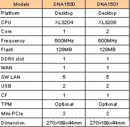 DNA1500 和 DNA1501平臺(tái)提供2個(gè)MIPS64 XLS 核心, 8 fine Grain Threads, 32K/32KB L1 cache 和高達(dá) 1.0 GHz 操作性能。這兩個(gè)產(chǎn)品利用多線(xiàn)程技術(shù),即使一個(gè)線(xiàn)程停滯不前時(shí),其他線(xiàn)程繼續(xù)有效的處理指令。 自主的壓縮/解壓縮引擎卸載壓縮,它的功能就像一個(gè)自主IP 分段,解除額外的處理能力以使內(nèi)部擁有更大的效率和吞吐量。該安全引擎是支持IPsec和SSL的虛擬專(zhuān)用網(wǎng)絡(luò)( VPN )解決方案。DNA1500 和 DNA1501 包括XLS204 (單核)/XLS208(雙核) CPU的無(wú)風(fēng)扇設(shè)計(jì), 128MB Flash, 1個(gè) DDRII 槽可達(dá)1GB, 1xWAN, 5x switch 口, 1xcompact Flash, 2x mini-PCI-E 和 2x USB 口。