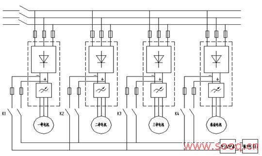 傳統(tǒng)設(shè)計是由一臺變頻器控制一臺大功率電機通過機械長邊軸拖動四臺單元機,其問題是:(1)機械長邊軸安裝調(diào)整困難,靠機械無級變速器調(diào)節(jié)牽伸倍率精度差,不直觀;(2)單臺電機運行參數(shù)無法準確獲得;(3)難以實現(xiàn)四象限運行,從而很難適應(yīng)較大牽伸倍率的需要。